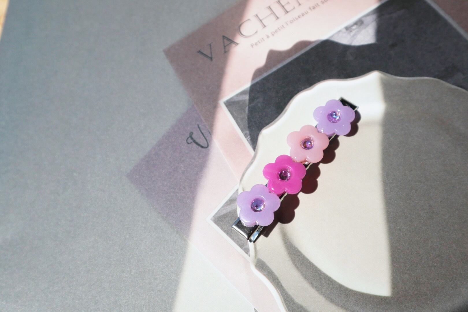 パステルな紫と少しビビッドなピンクがとても可愛く、女の子が好きそうな色味のヘアクリップです。
