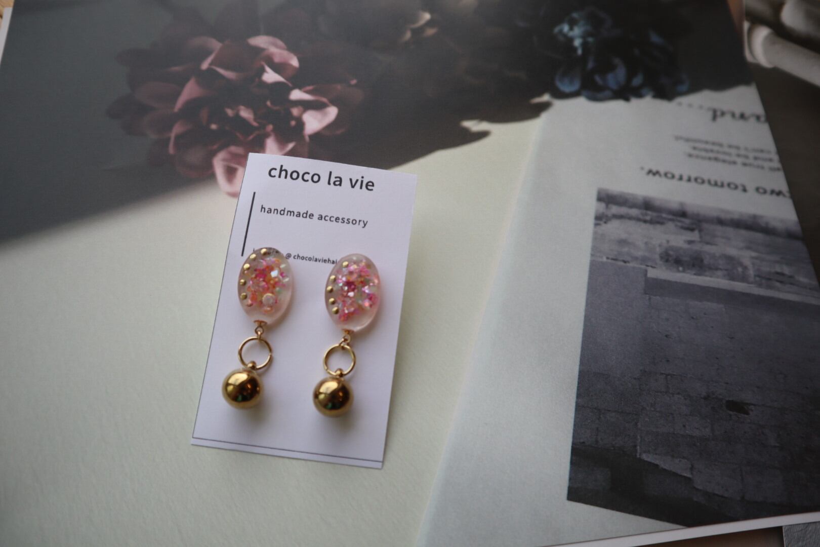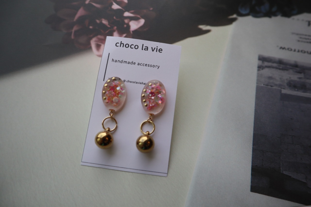ピンク×ゴールドの揺れるピアス